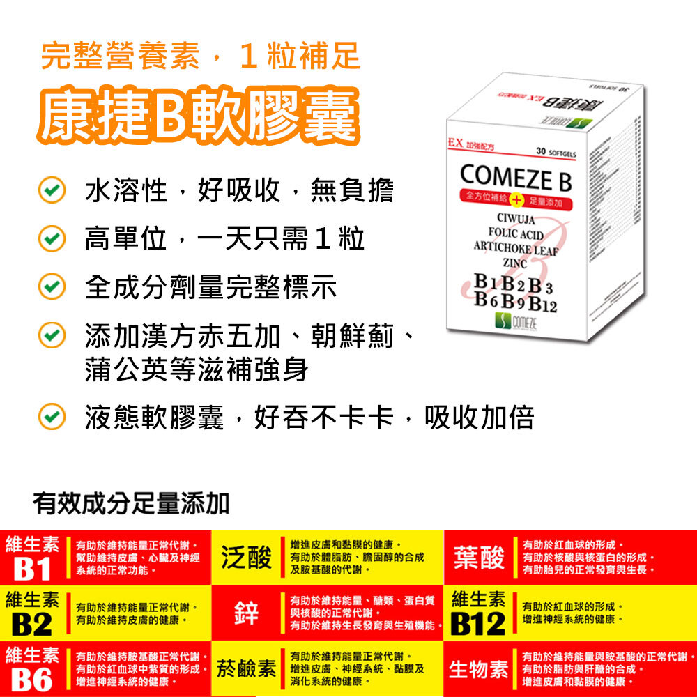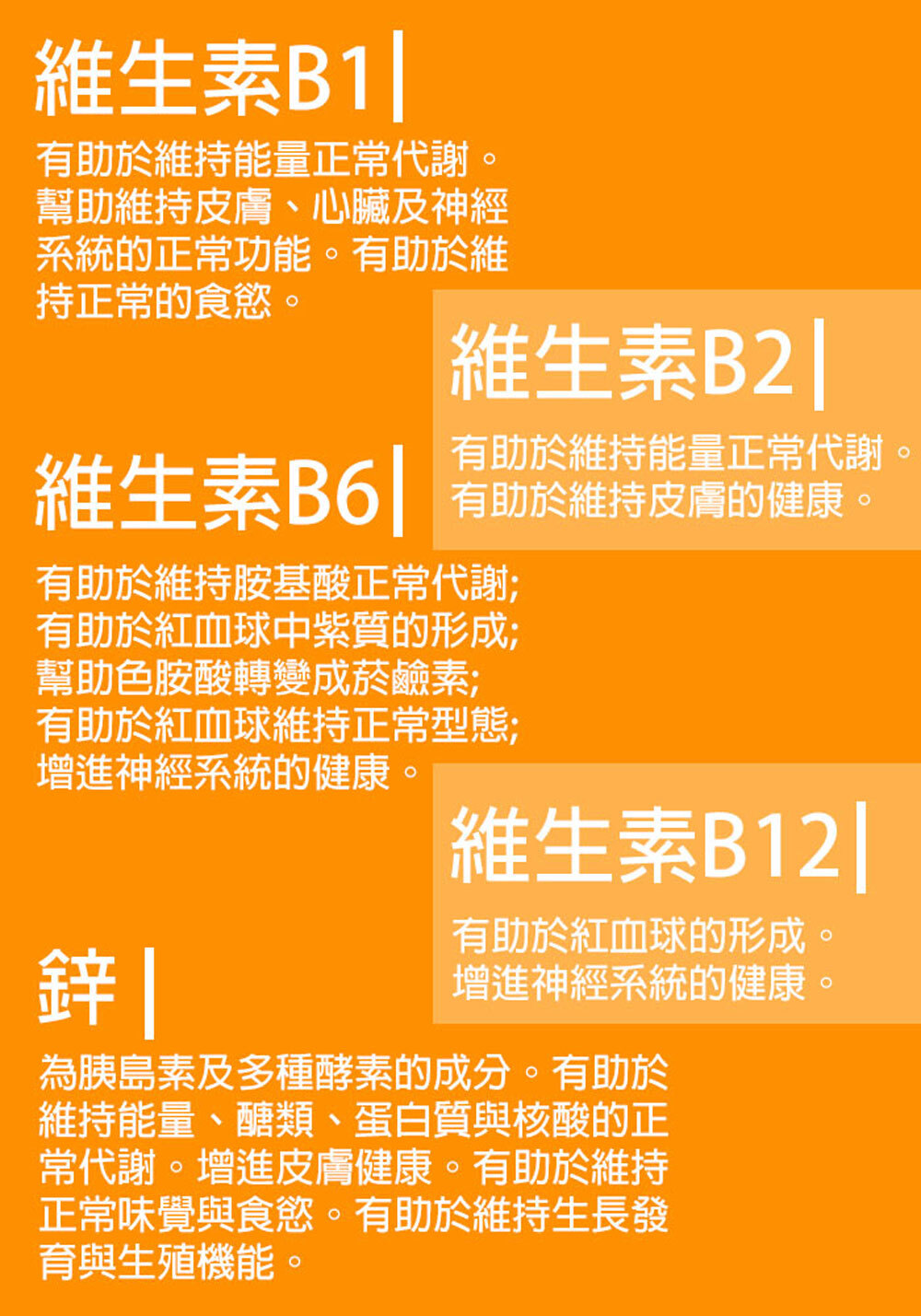 成 分:維生素B2、維生素B1、維生素B6、本多酸鈣、肌醇、菸鹼醯胺、葡萄糖酸鋅、重酒石酸膽鹼、刺五加萃取物、L-苯丙胺酸、朝鮮薊萃取物、蒲公英萃取物、肝精、葡萄糖酸亞鐵、DL-蛋胺酸、鹽酸L-二胺基己酸、L-異白胺酸、L-a-胺基異戊酸、麩醯胺酸、L-羥丁胺酸、葡萄糖酸錳、硫酸銅、葉酸、生物素、維生素B12